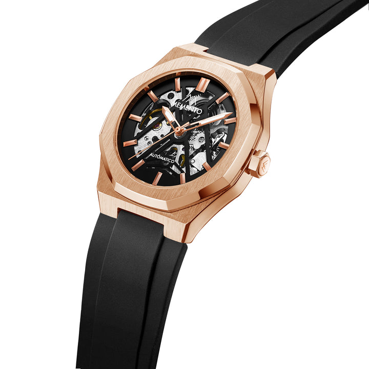 Ultimo ma non per importanza l’orologio Memento Oro Rosè con cinturino in silicone, apprezzato perché dona raffinatezza ed eleganza all’uomo sicuro di sé, quello che non deve chiedere mai! Grazie al movimento automatico assicura una durata eterna, mentre il cinturino in silicone nero regala un contrasto sportivo che lo rende adatto a ogni occasione.